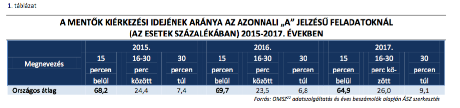 Míg 2010-ben a rendelkezésre álló adatok szerint 77,6 százalékban ért ki a mentő 15 percen belül a helyszínre, addig ez 2017-ben már csak 64,9 százalékban volt igaz.