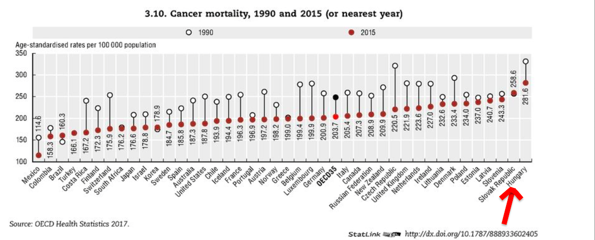 ma Magyarországon a rákhalálozások száma még mindig magasabb, mint az OECD országokban 1990-ben