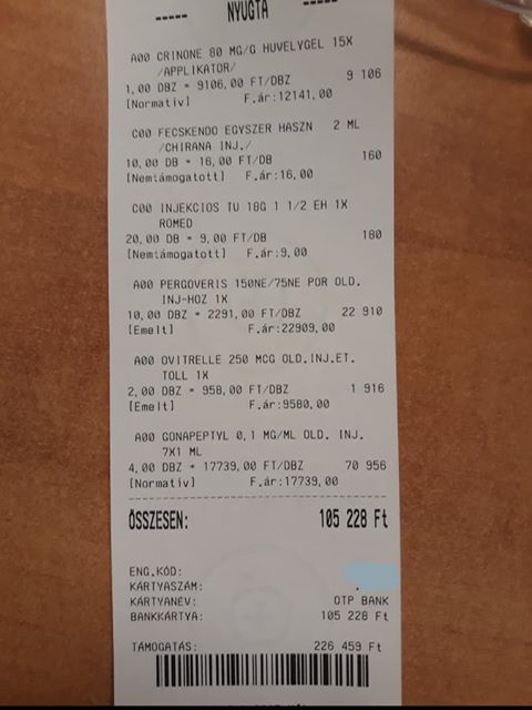 Erről tanúskodik az az email és számla, amit ma kaptam kézhez. A számlán egy, a meddőség kezelésében használatos gyógyszer és annak ára látható a mai napi vásárlással. A készítmény még úgy is meglehetősen drága, hogy 90 százalékos támogatással írható fel.