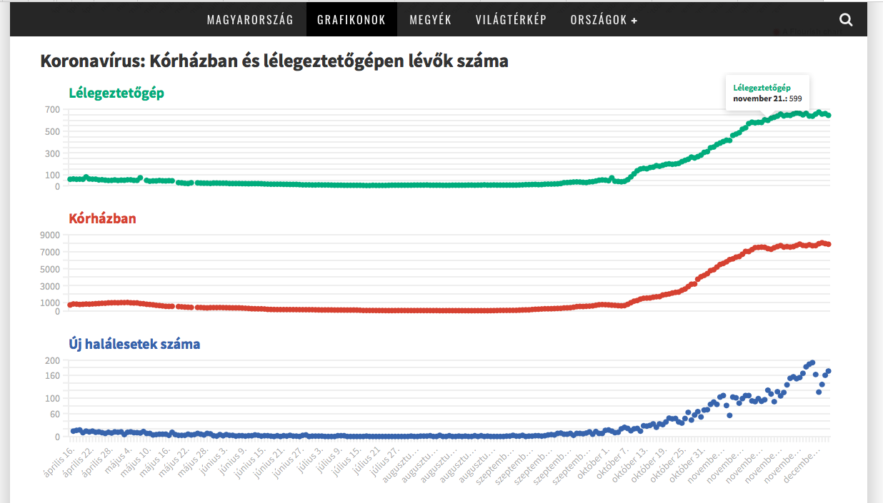 Hetek óta gyakorlatilag stagnál a lélegeztetett betegek az Operatív Törzs által kommunikált száma. Kisebb ingadozások megfigyelhetők, de november 21. után tízszázalékos eltérésnél nagyobb ingadozás alig-alig figyelhető meg, amit jól érzékeltet a pandemia.hu ábrája. Hasonlóan alakulnak a kórházban kezeltek számai is, itt sem figyelhető meg jelentős ingadozás.