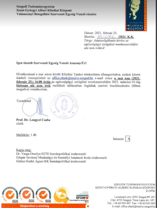 Ezt egy, a dolgozóknak megküldött tájékoztató, információs email tartalmazta. Amely így kezdődik: “Tegnap egy értekezleten voltam, ahol az Egészségügyi szolgálati jogviszonyról néhány információt kaptam, szeretném megosztani mindenkivel!