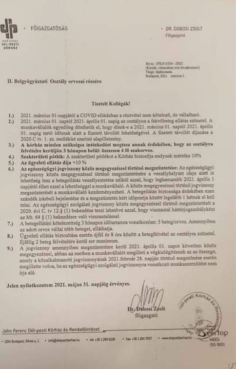 A nyilatkozat alapján éppen a legnagyobb terhelés alatt kapott a szerződést aláíró orvos egy hónapos fizetett szabadságot a fekvőbeteg-ellátás szüneteltetésének terhére és kapott felmentést a jövőben a COVID fertőzöttekkel kapcsolatos munkavégzés alól. Lehetővé tette a főigazgató az ott dolgozóknak a veszélyhelyzet alatti felmondást is, ami ugye ellentmond más magasabb jogszabályi rendelkezéseknek, így ennek jogszerűsége is megkérdőjelezhető. További engedmények az orvosok számára a kórház saját hatáskörében megemelt szakterületi- és ügyeleti pótlék.