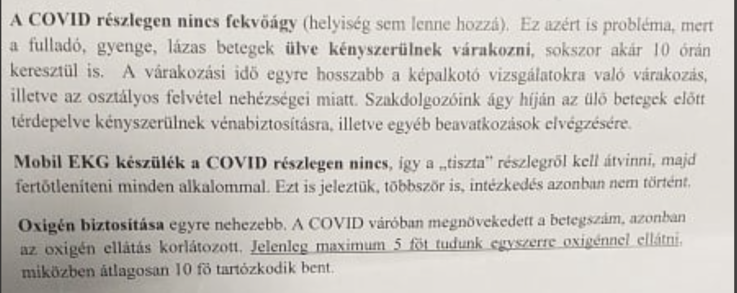 Ahogyan írják, a sürgősségi osztályon 5 szakdolgozói státusz évek óta üres és ehhez most további 8 szakdolgozó hiányával is meg kell küzdeniük, de hasonlóan siralmas az orvos-helyzet is, amit súlyosbít az is, hogy a vállalkozó orvosok szerződéseit felmondták, új szerződésük pedig nincs. Nem megnyugtató a tárgyi eszközök állapota, illetve hiánya sem. A levél szerint a sürgősségi osztály COVID részlegén nincsen fekvőágy, a lázas, fulladó betegek ülve várják a sorukat, de mobil EKG sincsen ott külön, ezt a tiszta részlegből kell átvinni. Talán ami a legjobban jellemzi az egész magyar egészségügy felkészülését az immár lassan két éve tartó járványhelyzetben, az a következő mondat: “Oxigén biztosítása egyre nehezebb…Jelenleg maximum 5 főt tudunk egyszerre oxigénnel ellátni, miközben átlagosan 10 fő tartózkodik bent”
